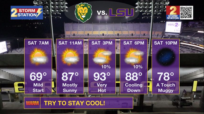 LSU Football: Fans heading to LSU on Saturday can look forward to another hot and mostly sunny day, with afternoon highs topping out in the low 90s. Just like last weekend, it’ll be important to pack sunscreen, stay hydrated, and find shade when you can. Rain chances sit around 10%, meaning most will stay dry, though a stray shower can’t be ruled out. Even after kickoff, the humidity sticks around, with temperatures slowly easing from the 90s into the lower 80s by evening.