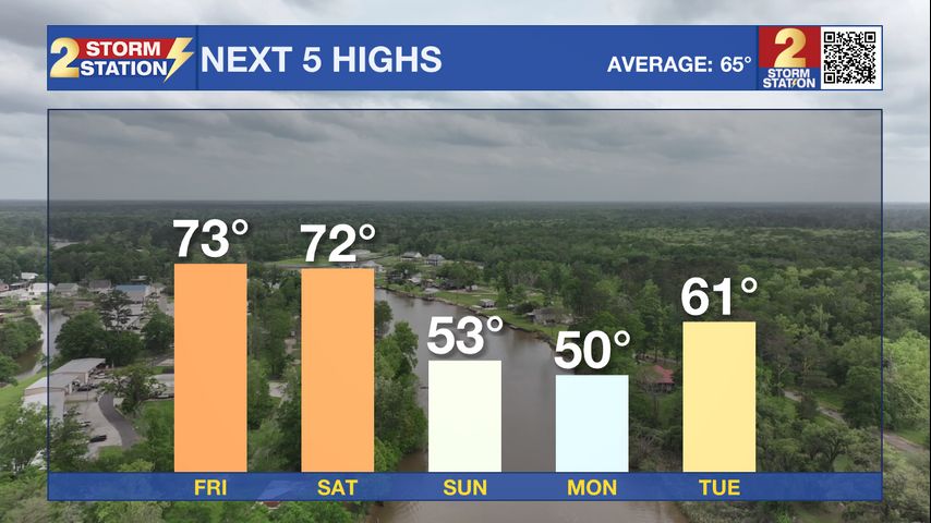 Today and tonight: Today brings a notable warmup thanks to a persistent onshore flow. Highs this afternoon will reach the lower 70s across the Baton Rouge area, running around 8–10 degrees above climatological averages. Skies stay partly to mostly cloudy, but the day remains generally dry. Rain chances will stay around 20%.