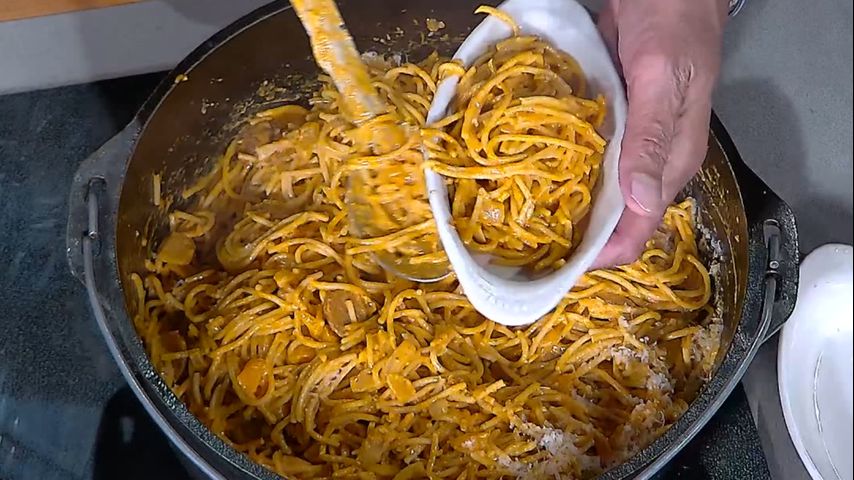 Add the cooked spaghetti and the reserved pasta water to the pan. Toss everything together so the pasta is fully coated in the creamy sauce. Let it simmer on low heat for an additional 5 minutes to allow the flavors to meld.