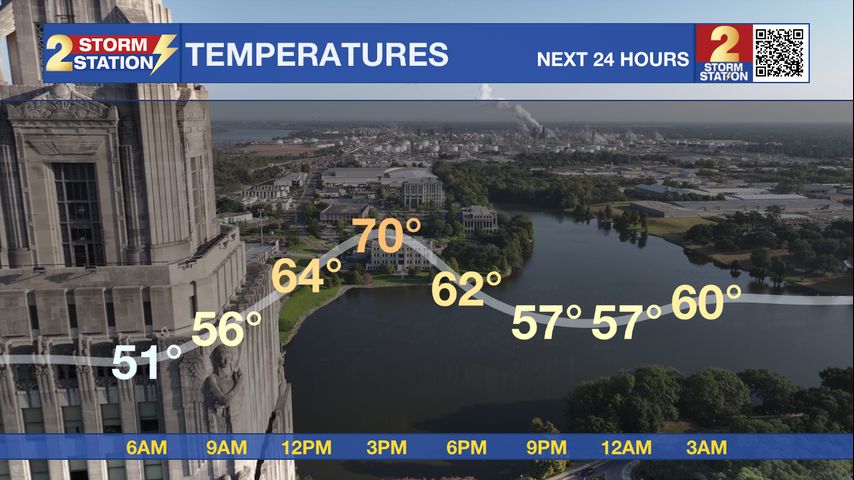 Today and tonight: Monday starts cloudy and quiet across Baton Rouge and the Capital Region as high pressure remains in control. Skies should become partly cloudy, and if sunshine returns, temperatures will warm into the lower 70s by afternoon. Southerly winds gradually return during the day, allowing humidity to slowly increase. Monday night stays dry and mild with lows dipping into the low 50s.