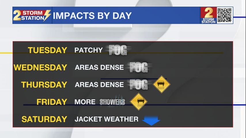 Up Next: Patchy and occasionally widespread morning fog will be a possibility on Wednesday and Thursday, as well. With students returning to the classrooms this week, be extra cautious in foggy spots while keeping an eye out for school buses. Afternoons will be unseasonably warm as highs flirt with the 80° mark.