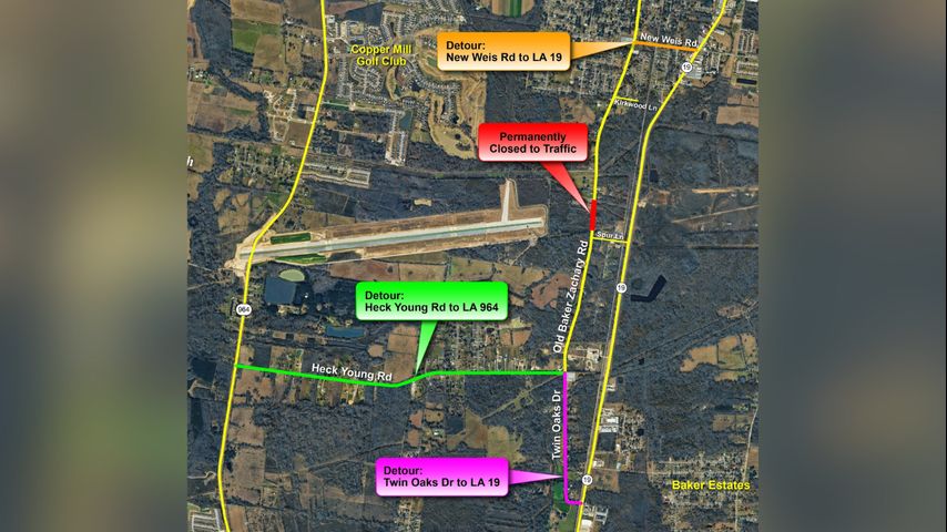 - Residents south of Spur Lane can travel south on Old Baker Zachary Road to Heck Young Road to reach La. 964 or Twin Oaks Drive to reach La. 19.