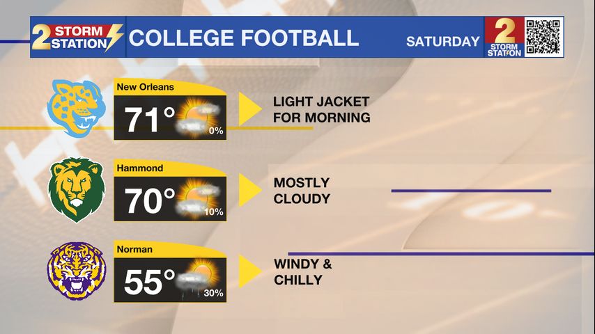 Football Forecast: For the game in Norman, OK, expect cool, breezy conditions with showers ending around game time. Temps will hover in the mid-50s, and gusty winds could make it feel a bit colder. At Southeastern Louisiana in Hammond, the weather should stay mild and mostly dry — highs around the upper 60s with comfortable humidity, especially through the weekend. For Bayou Classic in New Orleans. Clouds will be around, but obviously, perfect weather conditions inside the Superdome.