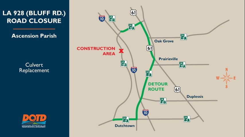 From LA 427 (Perkins) — Bypass LA 928 to US 61. Take a right onto US 61 southbound to LA 73. Turn right onto LA 73 and travel westbound to LA 74. Take a right onto LA 74 northbound. Continue on LA 74 until the signal at LA 928. Take a right onto LA 928 to complete the detour.