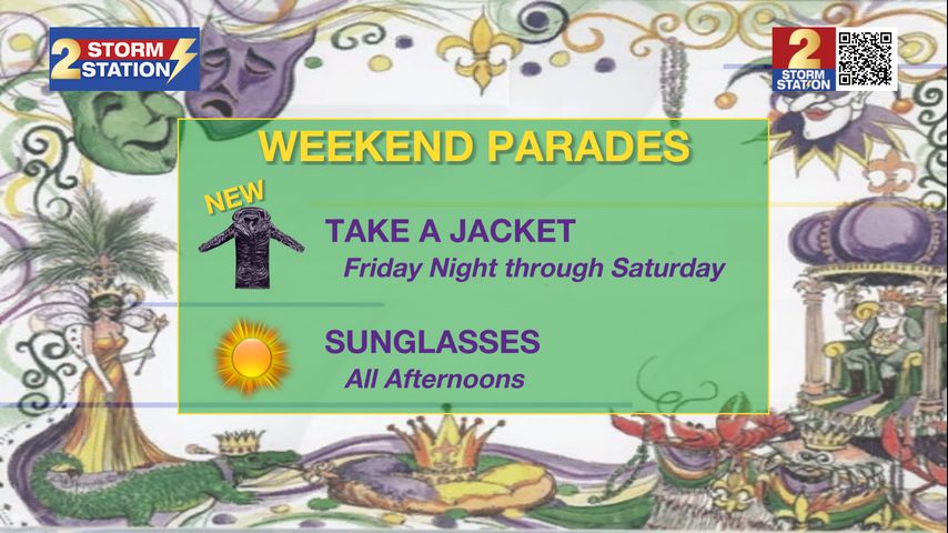 Mardi Gras parades will be in great shape this weekend. Conditions will certainly be dry, and winds will be light. Friday and Saturday night will be falling out of the 60s and into the 50s—cool enough that you’ll want to have a layer to add. Even Saturday afternoon now looks a few degrees cooler than it did earlier in the week, and so long sleeves might be more comfortable than short sleeves. Sunday afternoon will be about 5 degrees warmer.
